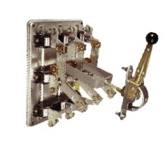 Выключатель-разъединитель на металлической плите с центральным рычажным приводом на номинальный ток 250 А, номинальный ток плавкой вставки предохранителя 100 А: